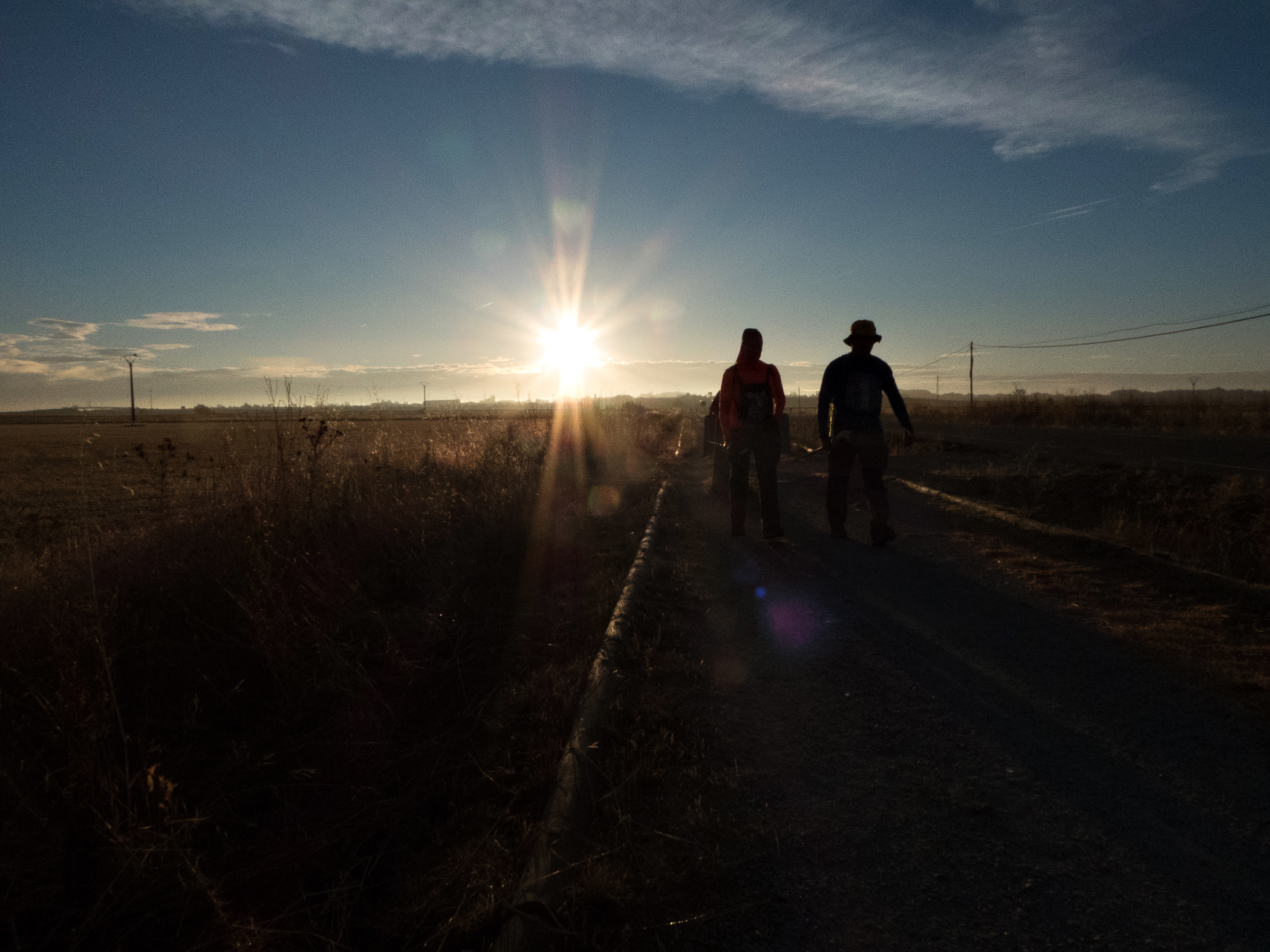September 16, 2016: The way is dark as we slip out of the village of Boadilla. The Camino follows a path along a dike that separates the Canal de Castilla from farmland on the left. Constructed between the last half of the 18th century and the first half of the 19th century, it runs 207 km and parts of it are still used for irrigation. ~Wikipedia