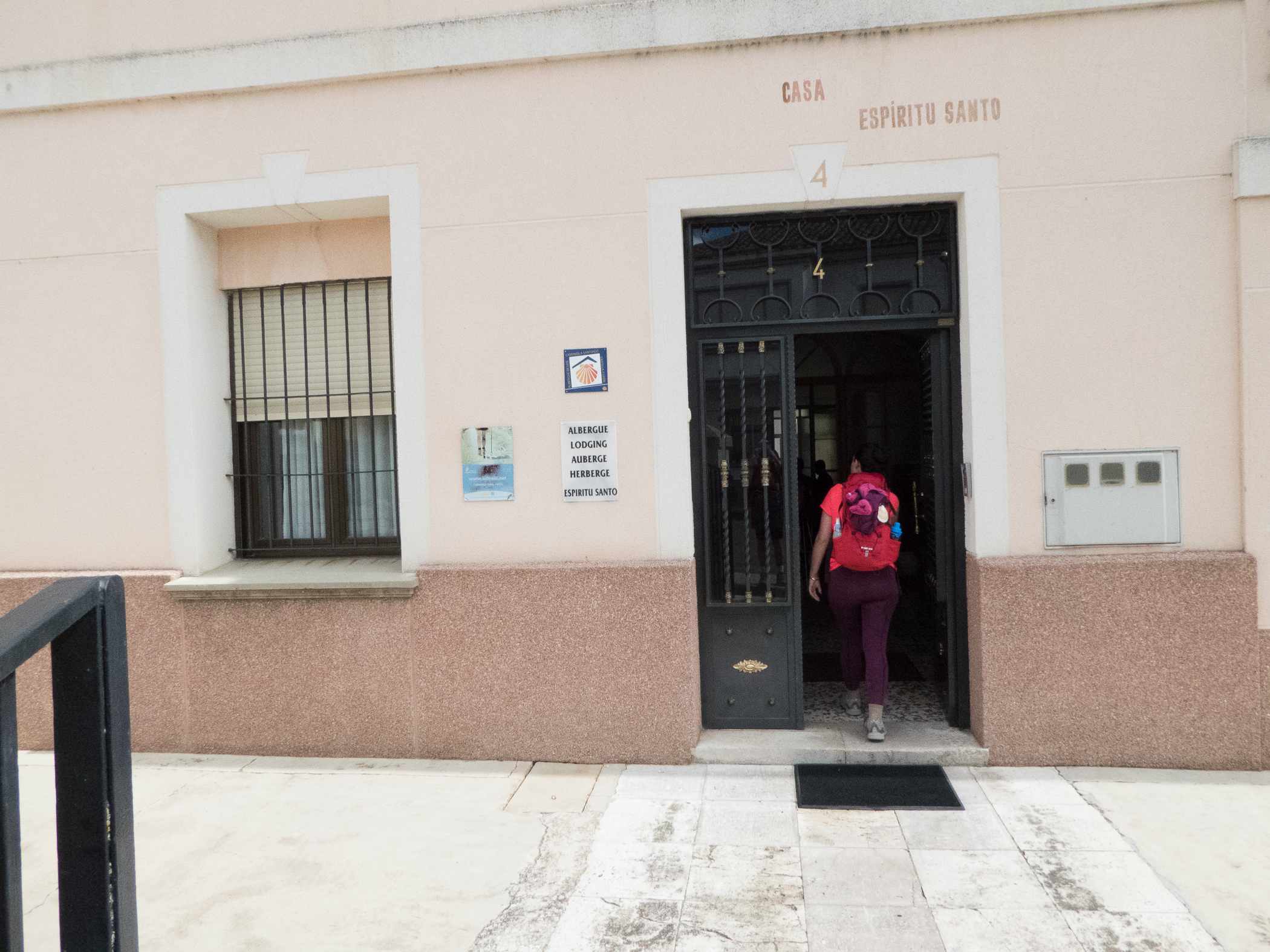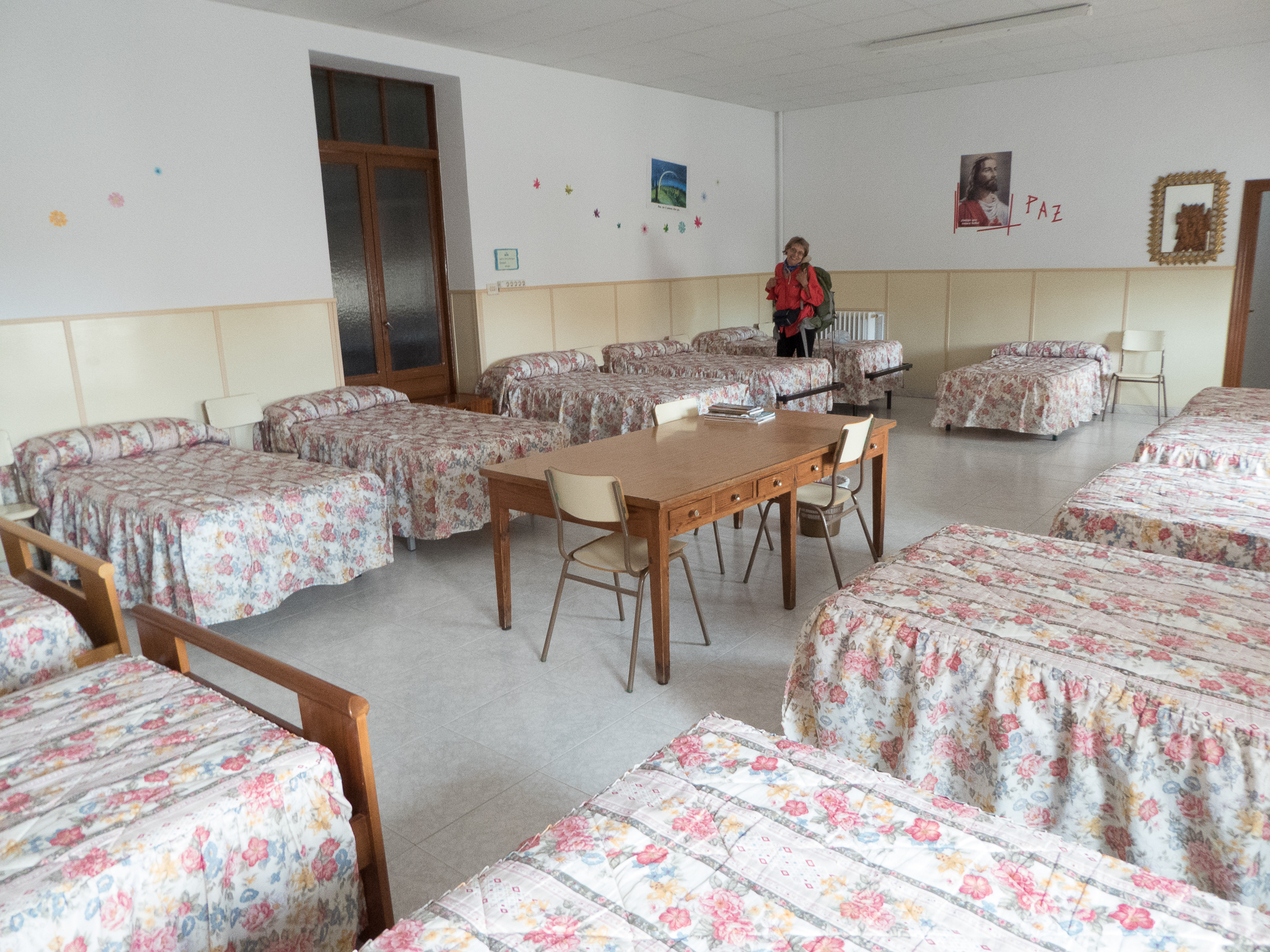 Wrong… Randy makes the trip across the bridge (While Joan and I have a cold beverage) to check out the bed situation and discovers Albergue de Peregrino opens at 4 p.m. and he is encouraged by camino friends to get our bags in line ASAP! We quickly get all of our bags across the bridge and get in line for beds. When the doors do open we stand in a long, slow line for well over an hour, but it’s worth it as we do get beds.