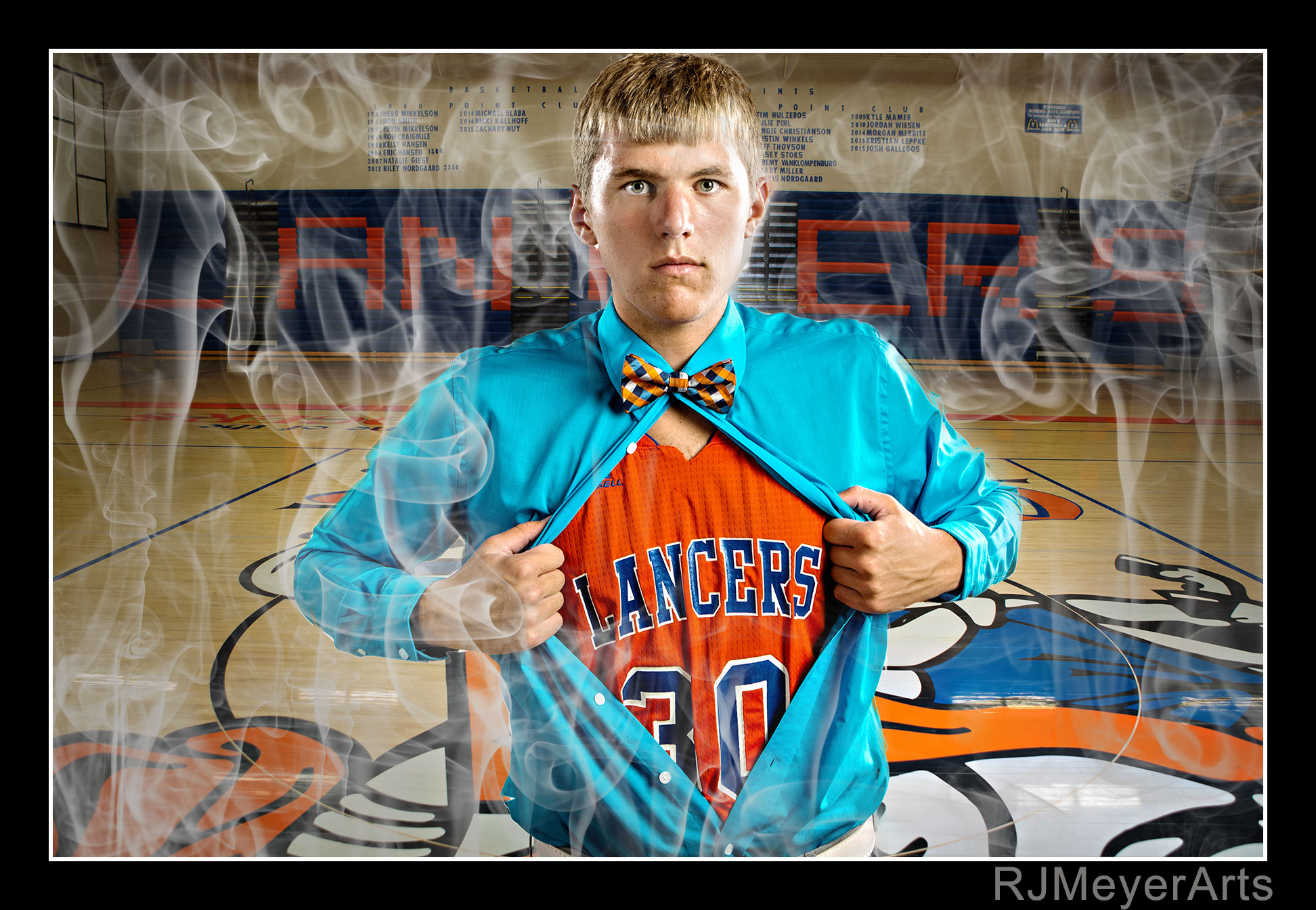 Foreground image was taken in the studio with accent lights on both sides of the face and one light to camera right. Background looked too dull and I wanted to “jazz it up” . Many hours of blood sweat and tears take place on and off the court so decided to try blending the subject with a background photo of the gym. Still too blah…